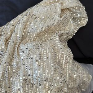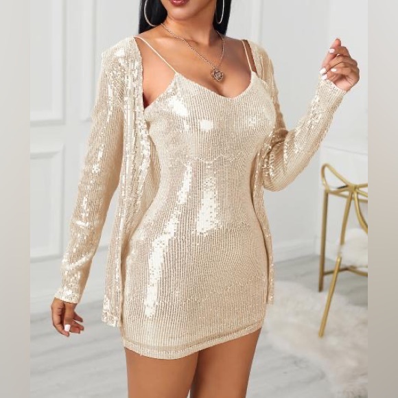 Beautiful body on dress full of sequin and sparkle elastic shoulder straps with matching wheel sequin long sleeve cover jacket. Set the night off wearing this paired with some buds or black heels she is the perfect party dress!! Excellent stretch
