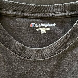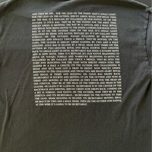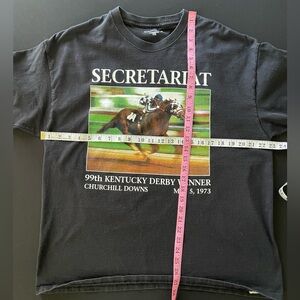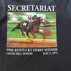 This is a black Champion T-shirt featuring a graphic of Secretariat winning the 99th Kentucky Derby on May 5, 1973.