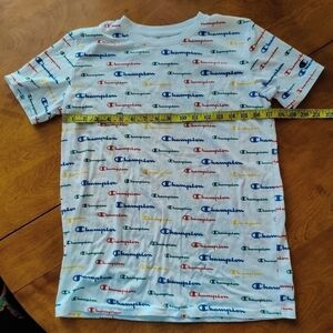 Perfect condition. Multicolor Champion logos all over front and back. Measures approximately 17" pit to pit and 25" long.