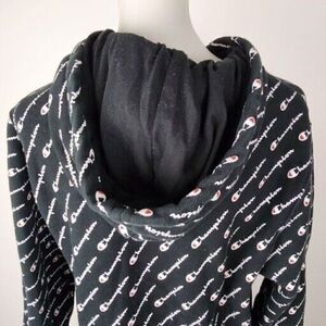 Champion All Over Print Logo Black Reverse Weave Thread Hoodie Sweatshirt Mens M