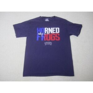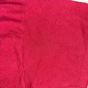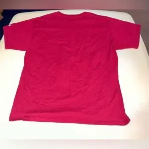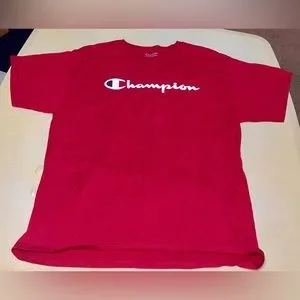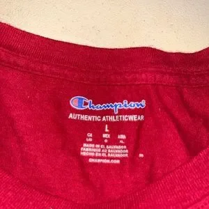 This Champion athletic shirt boasts a crew neck design, short sleeves, and a bold red hue with complementary design accents on the front and sleeve. A visible stain on the sleeve is captured in the accompanying images. Key details include a unisex design, tagless construction, and a men's Large size classification, with the garment being pre-owned. Both the front and back of the shirt are pictured, along with additional images.