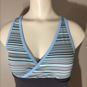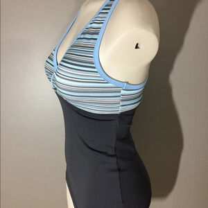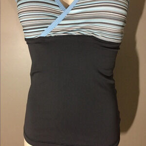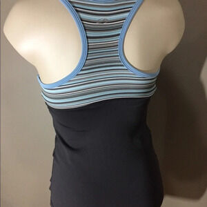 Like new Champion athletic tank, only tried on (too small). Built in shelf bra, racer back tank. Dark gray bottom with light blue, white & gray striped top. From smoke free and pet free home.