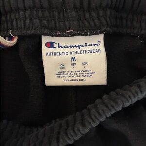 Classic black athleticwear by Champion. Features iconic logo. Perfect for workouts. Drawstring.