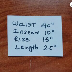Measurements: waist 40", Inseam 10" Rise 15", Length 25"