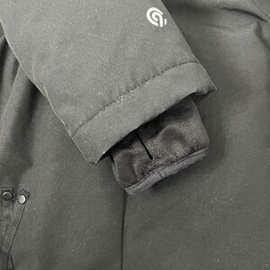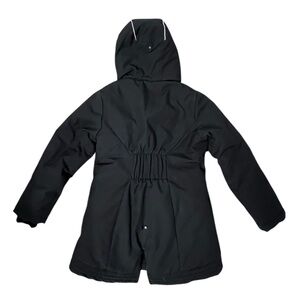 Champion Black Hooded Water Resistant Jacket. Size 6/6X. Unisex. Two pockets in the front, 2 pockets on chest (we used to put warmers in there) and inner jacket area have thumb holes. Great preloved condition! Will keep the kiddos toasty! Measurements in pics, however additional measurements available upon request.
