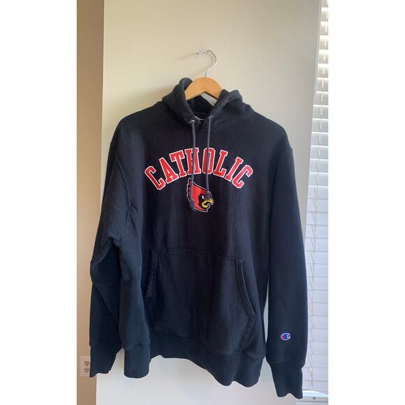 Champion hoodie featuring bold red and white lettering. Comfortable fit with a classic design. Perfect for casual wear.