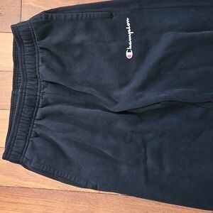 Stylish black joggers featuring the iconic Champion logo. Perfect for casual wear. drawstring elastic waist. two side pockets. unisex size small