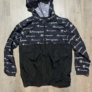 Stylish black windbreaker jacket with Champion logo print. Features a hood and full zip closure. Size Small in Boys. Never Worn