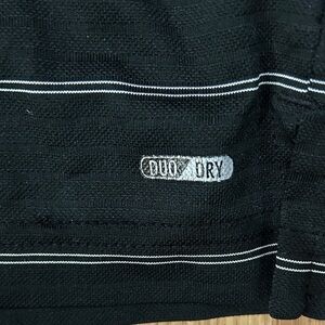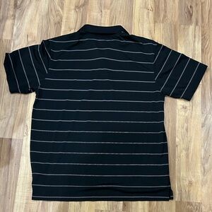 Classic black polo with sleek gray stripes. Perfect for casual wear.