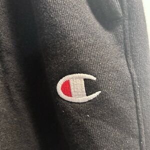 Stylish black fleece sweatpants by Champion. Features drawstring waist and 3 pocket design. NWOT. Iconic Champion logo on leg. Size S.