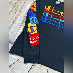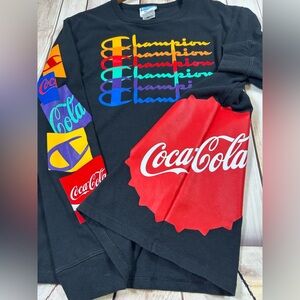 Classic black long sleeve sweatshirt featuring the iconic Champion and Coca Cola Logos. Pop Culture.