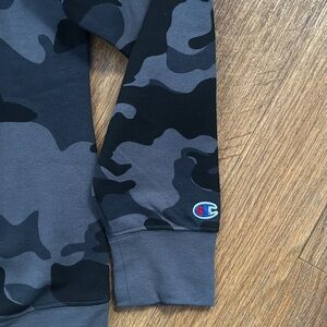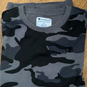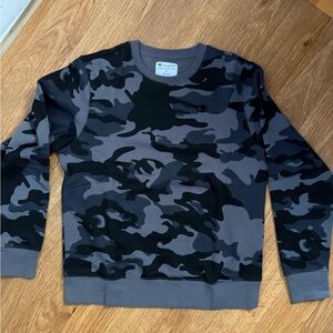 This Champion crewneck sweater features a stylish black and gray camouflage pattern, perfect for casual wear. Made from a soft, cotton-based fabric, it offers comfort and warmth with its long sleeves and ribbed cuffs. The classic design is complemented by a ribbed hem, ensuring a snug fit.