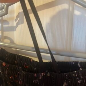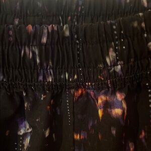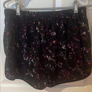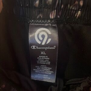 Vibrant Champion shorts with a unique pattern. Black base with purple and orange details. Ideal for active wear.