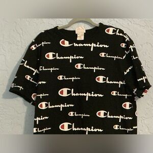 Bold black tee with iconic Champion logo pattern. Ideal for everyday style.