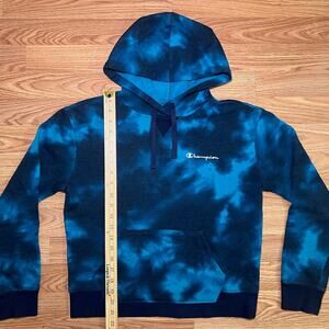Keywords: blue tie dye champion hoodie, Y2K fleece pullover sweatshirt, champion small hoodie, soft cozycore loungewear, vintage athletic hoodie, 90s streetwear sweatshirt, retro drawstring hoodie, women’s small blue hoodie, women's champion hoodie, cloud tie dye champion, sporty casual fall hoodie, champion embroidered pullover, skater girl aesthetic hoodie, ocean blue tie dye sweater, comfy throwback fleece hoodie, cozycore