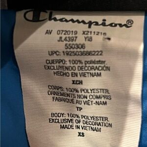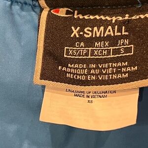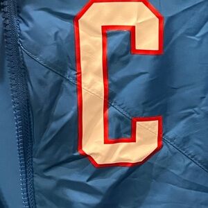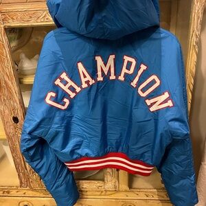 Used like new. Embrace a sporty look with the Champion Jacket, featuring a striking blue and red color scheme. This jacket showcases a classic 'C' logo patch on the chest and red and white striped ribbed banding, offering a modern twist on traditional varsity style. Its relaxed fit and cropped length make it a versatile addition to any casual wardrobe. PTP 20 inches. Length 19 inches.