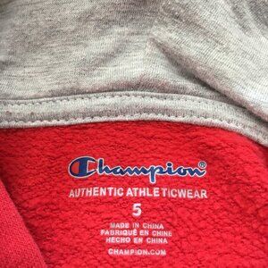 Champion boy's red sweatshirt hoodie size 5, pre-owned in good condition, shows some wear on front pocket.