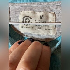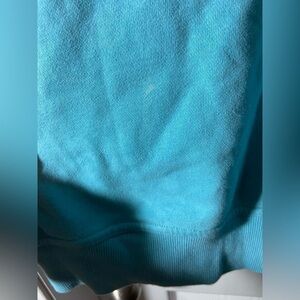 This women's sweatshirt by Champion is perfect for any activewear occasion. The relaxed fit and pullover style make it comfortable and easy to wear, while the side zipper and crew neck add stylish accents. The solid teal color and fleece fabric type make it a cozy addition to your wardrobe. The size is medium and it is a regular fit. It is a pre-owned item, but still in great condition. Get ready to look and feel great in this Champion sweatshirt. Might be a very small stain on shirt can’t tell if it is part of the coloring or not kinda looks faded in a spot
