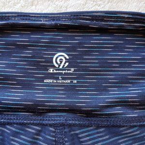 Cropped workout leggings or capris from Champion's C9 line, just under knee length. Wide and comfy waistband is approx. 15.5" measured flat with interior key pocket for running, wearing to the gym, or any kind of exercise. Gusset for range of motion. Color is dark blue with subtle space dye streaks in blue and white, and is squatproof! Great condition: bought new a few years ago and barely worn, from my own personal closet. No flaws or stains.