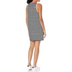 A Super cute tank dress black and white striped with contrasting peach/light orange and fuchsia ribbed trim,peach/light orange “Champion” script at chest, and “C” logo at bottom.