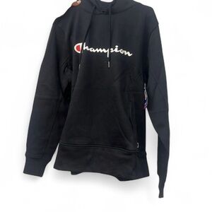 Sleek black hoodie with iconic Champion logo. Perfect for casual wear.