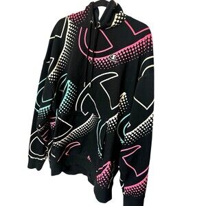 The Champion Classic Fleece 2XL Hoodie features a vintage style with a graphic print of colorful C's and polka dot shadow graphics, making it a nostalgic addition to your wardrobe. Made from a blend of polyester and cotton, this pullover hoodie is perfect for fall, winter, or spring. The black hoodie with the Champion logo is a versatile piece that can be worn for various activities such as gym training, running, or skateboarding, adding a sporty touch to your look. Ideal for those who appreciate retro and 80s-inspired fashion, this hoodie offers both style and comfort.