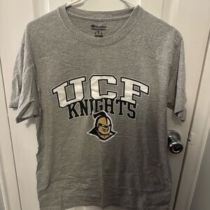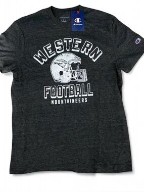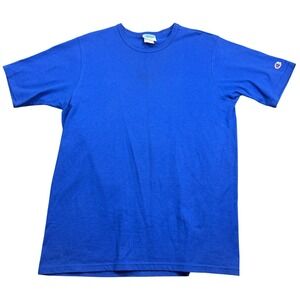 This short sleeve t-shirt is maroon. Champion is written in white on the front of the chest. There is a logo on the sleeve. There are some wear and tear marks on the front of the shirt (pictured). Made with 100% cotton. Pre-owned-good condition.