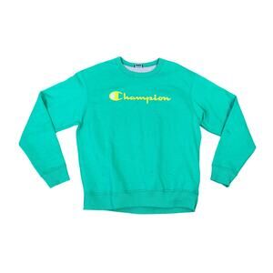 The Champion Crewneck Sweatshirt offers athletic comfort with its classic long sleeve design and iconic branding. This green and yellow pullover features a relaxed fit and durable construction, perfect for casual wear or sporty outfits. Note the visible pilling and mark on the sleeve of this otherwise sturdy garment. The cozy fabric and timeless style make it ideal for weekend activities, lounging, or adding vintage athletic appeal to your wardrobe.