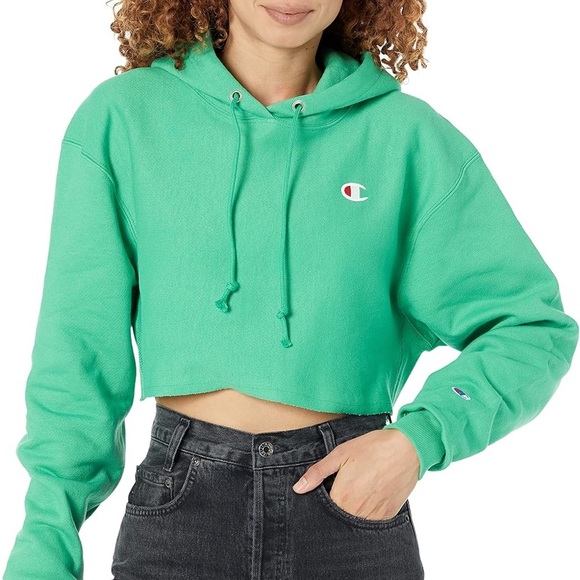 Embrace a sporty and stylish look with the Champion Green Cropped Hoodie Sweatshirt. This vibrant green top features a hood with drawstrings, long sleeves with ribbed cuffs, and a cropped, boxy silhouette. Perfect for casual outings, it combines comfort with a trendy design.