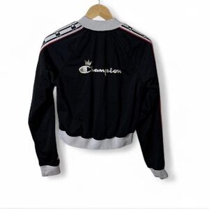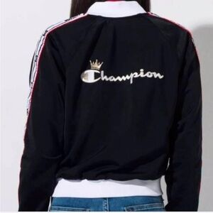 Stylish Champion zip-up track jacket in black with white and red accents. Features embroidered crown logo on chest and logo tape down the sleeves.