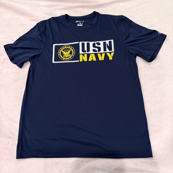 Men’s Champion USN Navy performance T-shirt in size Medium. Officially licensed design featuring the US Navy emblem and bold USN NAVY lettering across the chest. Shirt is made of 100 percent polyester for a lightweight, breathable athletic feel. Color is a deep navy blue with the Champion “C” logo on the left sleeve. Measurements are approximately 21 inches pit to pit and 28 inches from shoulder to hem. Shirt is pre-owned and in excellent condition with no holes, stains, or noticeable wear. Clean and ready to wear. Great for veterans, active duty, PT, or everyday casual use. Please review all photos for details and sizing. Fast shipping.