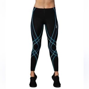 These Champion leggings feature a sleek black design with eye-catching light blue X-shaped accents, perfect for athletic activities. Made from a stretchy, form-fitting fabric, they offer comfort and flexibility for any workout. The full-length style ensures a streamlined look from waist to ankle.