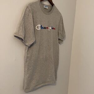Size medium Champion short sleeve gray t-shirt. Embroidered CHAMPION spell-out in red, white & blue.