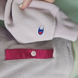 Cozy Champion fleece pullover. Features pink accents and buttons.