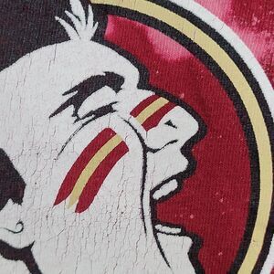 Champion Florida State shirt in red bleach-dyed splatter, women’s small 16x25. Vintage collegiate sporty vibe with bold retro street style