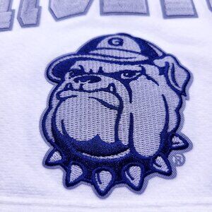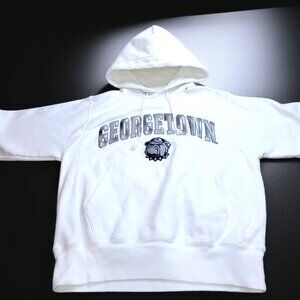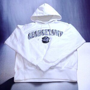 Features: Classic Champion hoodie featuring embroidered silver metallic GEORGETOWN lettering and Hoyas bulldog mascot logo. Heavy white pullover with drawstring hood and front kangaroo pocket. Perfect for game days, college pride, or casual everyday wear. Men’s size Small (unisex fit).