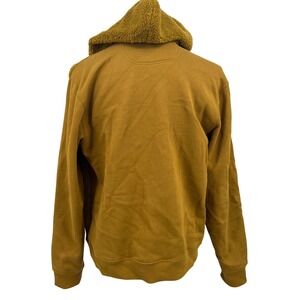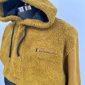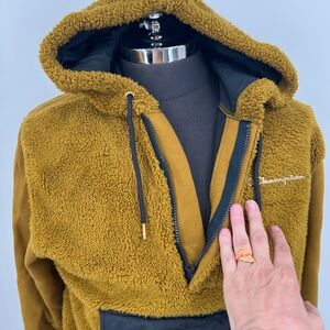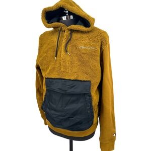 Champion Imperial Gold cuddle soft furry fleece accented with black nylon in the large kangaroo pocket. Gold metal Champion logo on chest. 1/2 zip, drawstring hoodie lined in black nylon. Sweatshirt fabric sleeves. Excellent condition, marked size L