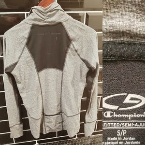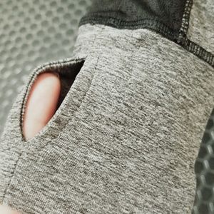 Gray fitted athletic jacket. Super soft and thin material. Polyester/breathable material. Very stretchy. Thumb holes in sleeves.