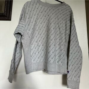 Stylish gray crew neck sweater. Features Champion logo pattern. Comfortable and casual. Tag says XL more like a large and sweatshirt.