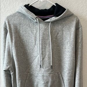 Classic heather gray hoodie with drawstring hood. Features front pocket and subtle logo detail. Ideal for everyday comfort.