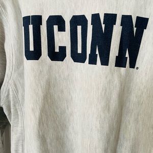 Comfortable gray sweatshirt. Features bold navy lettering. Classic Champion style.