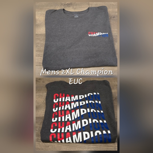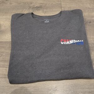 Stylish gray t-shirt featuring Champion logo. Bold red, white, and blue design.