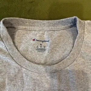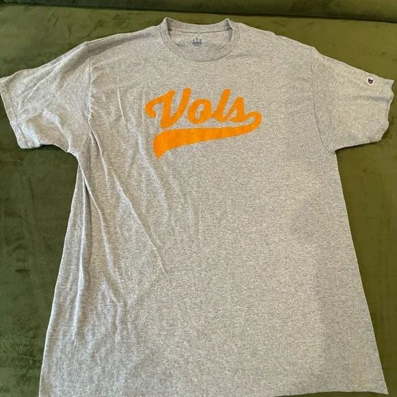 Champion short-sleeve tee featuring bold orange "Vols" script on a heather gray body. Soft jersey fabric for everyday wear. Classic crewneck silhouette for casual styling.