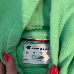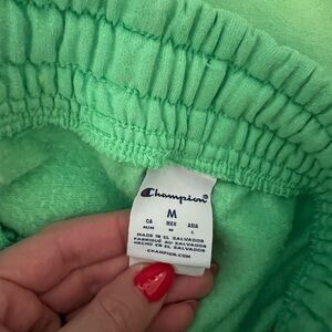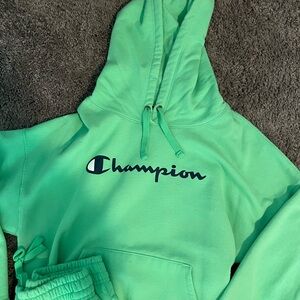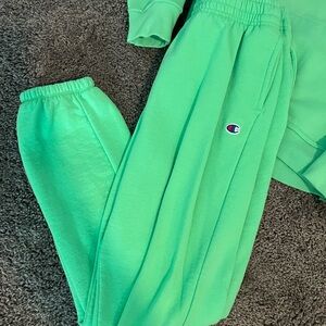 Vibrant green track pants and hoodie set. Features Champion logo. Comfortable and stylish.