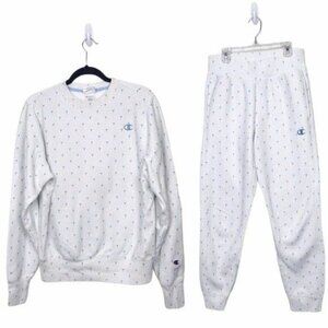 2 Piece. Blue & white cotton blend sweatshirt / sweatpant matching set by Champion in collaboration with HVN. Made from a super soft palm tree & polka dot knit.