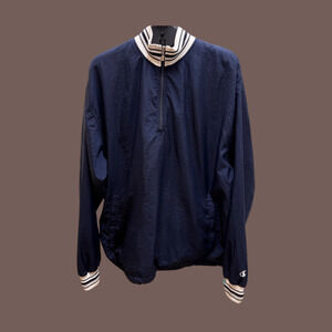Vintage 90s–early 2000s Champion half-zip pullover in deep navy with bold embroidered logos on the back and sleeve. Ribbed mock neck and cuffs with varsity-style striping. Nylon shell with soft poly-cotton lining—ideal for transitional layering. Features an adjustable drawcord hem and original silver “C” zipper pull.