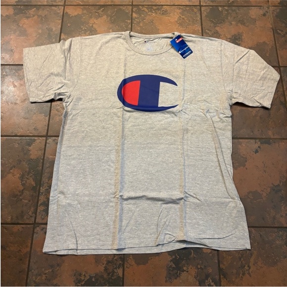 Heather gray tee with classic Champion logo. Soft and comfortable fabric.