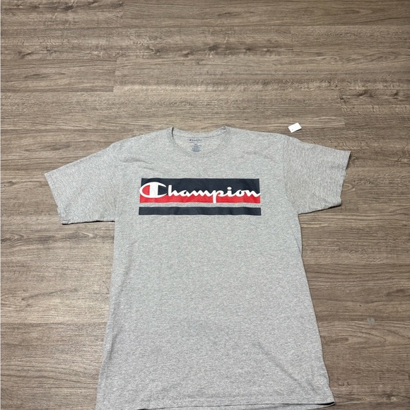 Classic Champion tee in heather gray. Features bold logo on chest. Soft and comfortable for everyday wear.