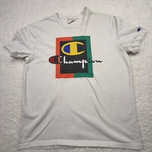 Champion Heritage "King of the Sweatshirts" graphic tee featuring bold white all-over print logos, crowns, and sketches. Classic Champion athletic streetwear style with embroidered sleeve logo.
