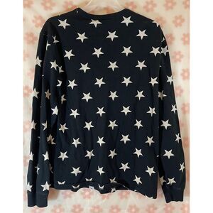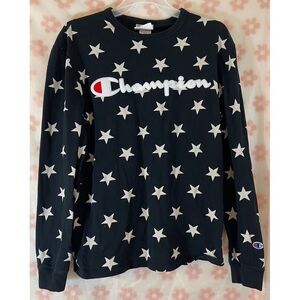 Classic Champion sweatshirt featuring all-over white star print pattern and iconic Champion logo across chest. Made from 100% cotton for comfort. Perfect for casual wear, athleisure styling, or lounging. In excellent condition with vibrant print and minimal wear. Heritage collection piece combines vintage appeal with modern comfort.